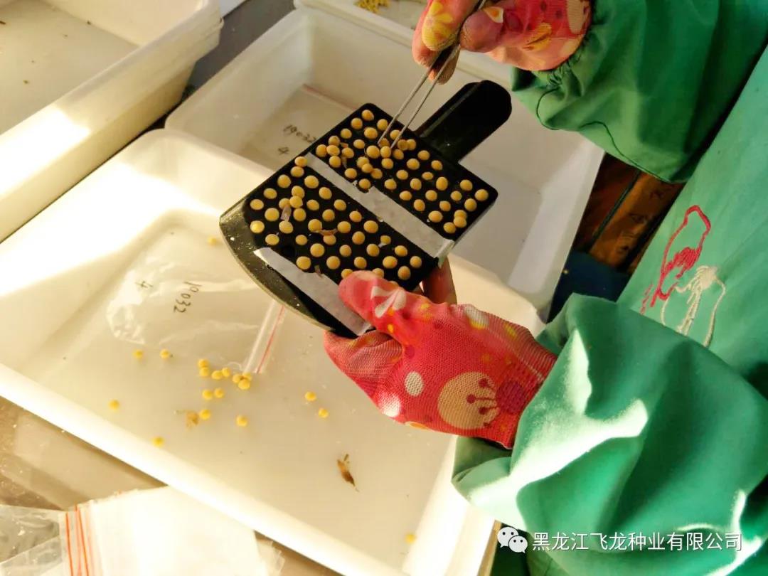 選種期間,科研人員需根據(jù)飛龍種業(yè)2020年的育種計劃,對大豆、玉米種子進(jìn)行嚴(yán)格篩選。具有良好品質(zhì)的種子,發(fā)芽率和發(fā)芽勢高,苗整齊茁壯。所以在選種時應(yīng)將病粒、蟲蛀粒、小粒、秕粒和破瓣粒揀出。